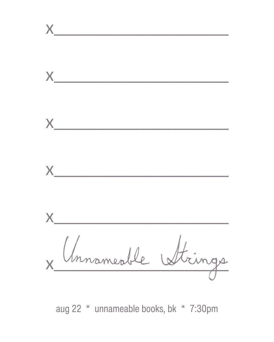 Aug. 23, 2025: A project co-organized and produced with Ana Luisa Diaz de Cossio at Unnameable Books (NYC), featuring an improvising string orchestra comprised of Liam Battle, Che Buford, Iva Casian-Lakos, Maggie Cox, Robert Feifan Hurley, David Macchione, and Elijah Spies.